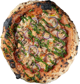 Bio drvené paradajky, prémiový španielsky tuniak, mozzarella, červená cibuľka, 24 mesačný parmezán, salsa calabrese, oregano, pesto