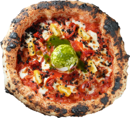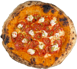 Krémový vodka sauce základ, mozzarella fior di latte, jemne pikantná talianská Salsiccia, ricotta, chilli med, drvené pistácie