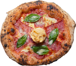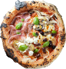 Bio drvené paradajky, mozzarella fior di latte, prosciutto crudo D.O.P., gorgonzola, parmezán, mozzarella di Buffala, olivy, celé rímske artičoky, portobello, bazalka, olivový olej