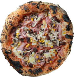 Bio drvené paradajky, mozzarella fior di latte, jemne údená šunka, parmezán, olivový olej, na výber kukurica, olivy, šampiňóny